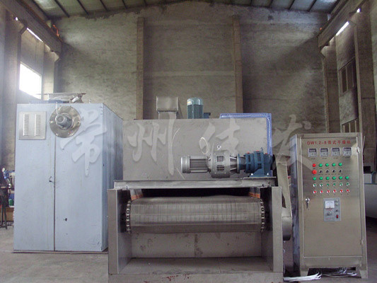 物料由加料器均勻地鋪在網(wǎng)帶上,網(wǎng)帶一般采用12-60目不銹鋼絲網(wǎng),由傳動(dòng)裝置拖動(dòng)在干燥機(jī)內(nèi)移動(dòng)。干燥機(jī)由若干單元組成,每一單元熱風(fēng)獨(dú)立循環(huán),部分尾氣由專(zhuān)門(mén)濕風(fēng)機(jī)排出,廢氣由調(diào)節(jié)閥控制,熱氣由下往上或由上往下穿過(guò)鋪滿物料的網(wǎng)帶完成熱量與質(zhì)量傳遞的進(jìn)程,帶走物料的水份。網(wǎng)帶緩慢移動(dòng),運(yùn)行速度可根據(jù)物料溫度自動(dòng)調(diào)節(jié),干燥后的成品連續(xù)落入收料器中。上下循環(huán)單元根據(jù)用戶需要可靈活配備,單元數(shù)量亦可根據(jù)需要選取。